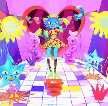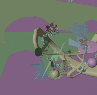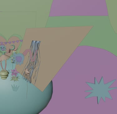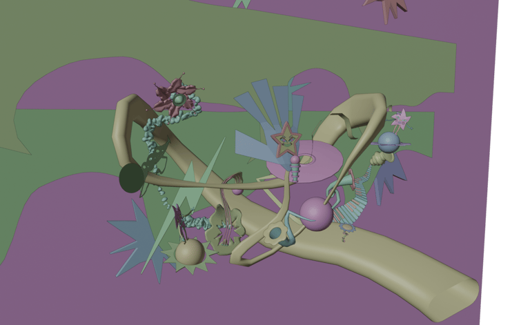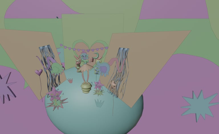 Destiné à la danse, il évoque une époque où l’audace vestimentaire, le glamour et la flamboyance étaient de mise. Ma scène représente alors l’intérieur d’une discothèque reflétant l’atmosphère festive et exubérante qui caractérise cette période. Le disco, avec ses rythmes entraînants, a marqué une transition vers une dimension plus électronique dans sa composition, créant ainsi une sonorité futuriste. Cette pièce étroite se déconstruit, pour nous emmener vers une machine loufoque symbolisant ainsi un emmêlement musical astral.